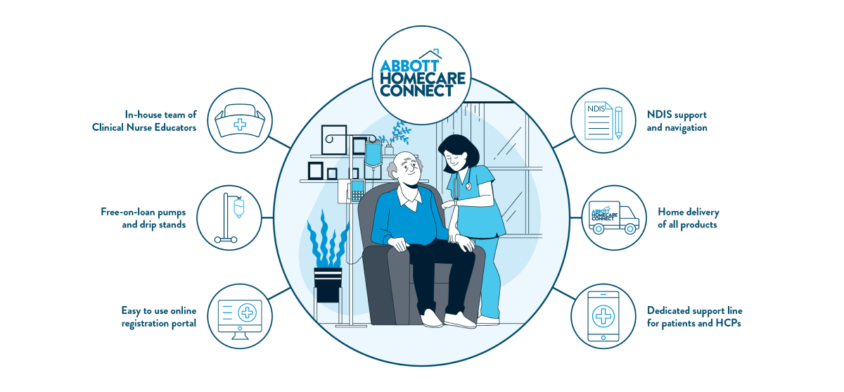 Transitioning from hospital to home can be daunting, but at Abbott, we're dedicated to making it as smooth as possible with our Abbott Homecare Connect program. With a team of Registered Nurses providing support nation-wide, our service offers comprehensive home support for patients, caregivers, and healthcare professionals. We collaborate closely with healthcare providers to tailor our support, ensuring quality care is delivered exactly where and when it's needed.