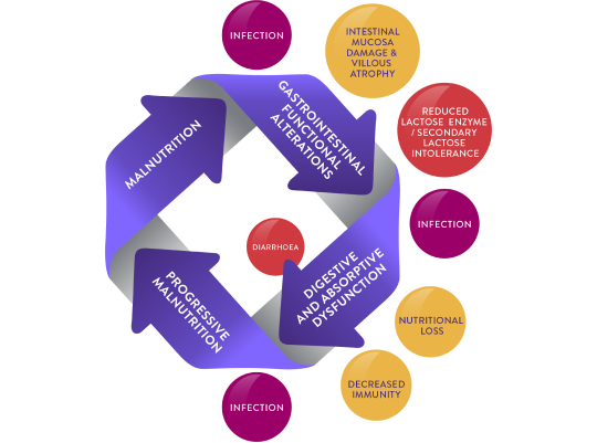 In what is referred to as the vicious cycle of malnutrition and malabsorption, compromised immunity and infection can lead to physiological changes including bi-directional interplay between GI function and malnutrition2 which can have lasting effects on growth and development.1